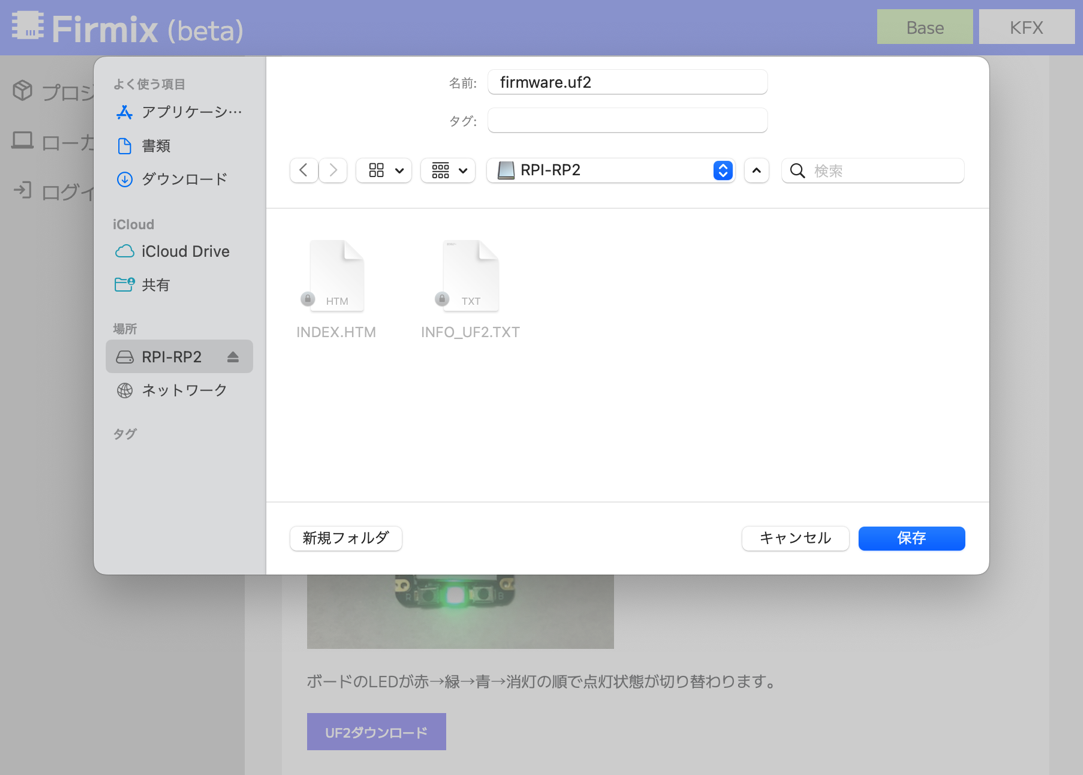 「UF2ダウンロード」ボタンを押すと、UF2ファイルの保存先を選ぶダイアログが表示されます 。